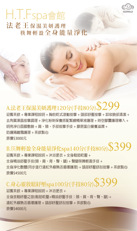 只要299元起,即可享有【H.T.F spa會館】A.法老王保濕美妍護理120分(手技80分) / B.筷舞輕盈全身能量淨化spa140分(手技80分) / C.身心靈放鬆紓壓spa100分(手技80分)立即結帳