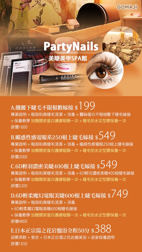 只要199元起,即可享有【Party nails美睫美甲spa館】A.翹麗下睫毛不限根數嫁接 / B.媚惑性感電眼系250根上睫毛嫁接 / C.6D輕羽濃密美睫400根上睫毛嫁接 / D.6D輕柔魔幻電眼美睫600根上睫毛嫁接 / E.日本正宗湯之花岩盤浴全程50分立即結帳